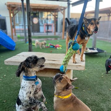 Drop-off after 6am and pick-up by 5pm seven days a week (or outside these hours by appointment since we're staffed 24/7 365 days per year). DOGS get supervised playgroups, in 3 shaded outdoor parks & 1 indoor beach-themed playroom w/turf, play equipment, shade, coolers, trees, and water features. CATS get cozy jungle-themed cat room w/roaming time in cat play area, windows, cat perch & tree, and cat activities.